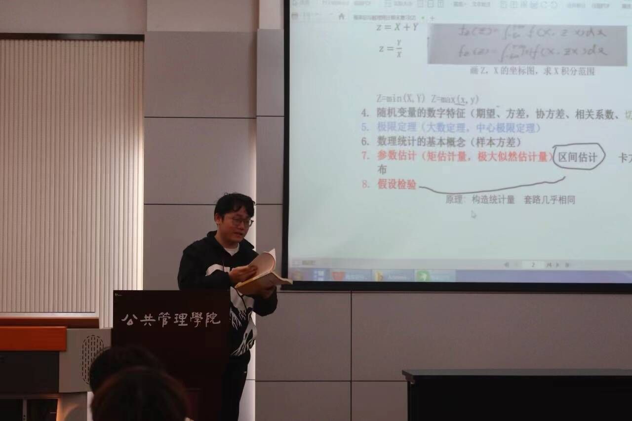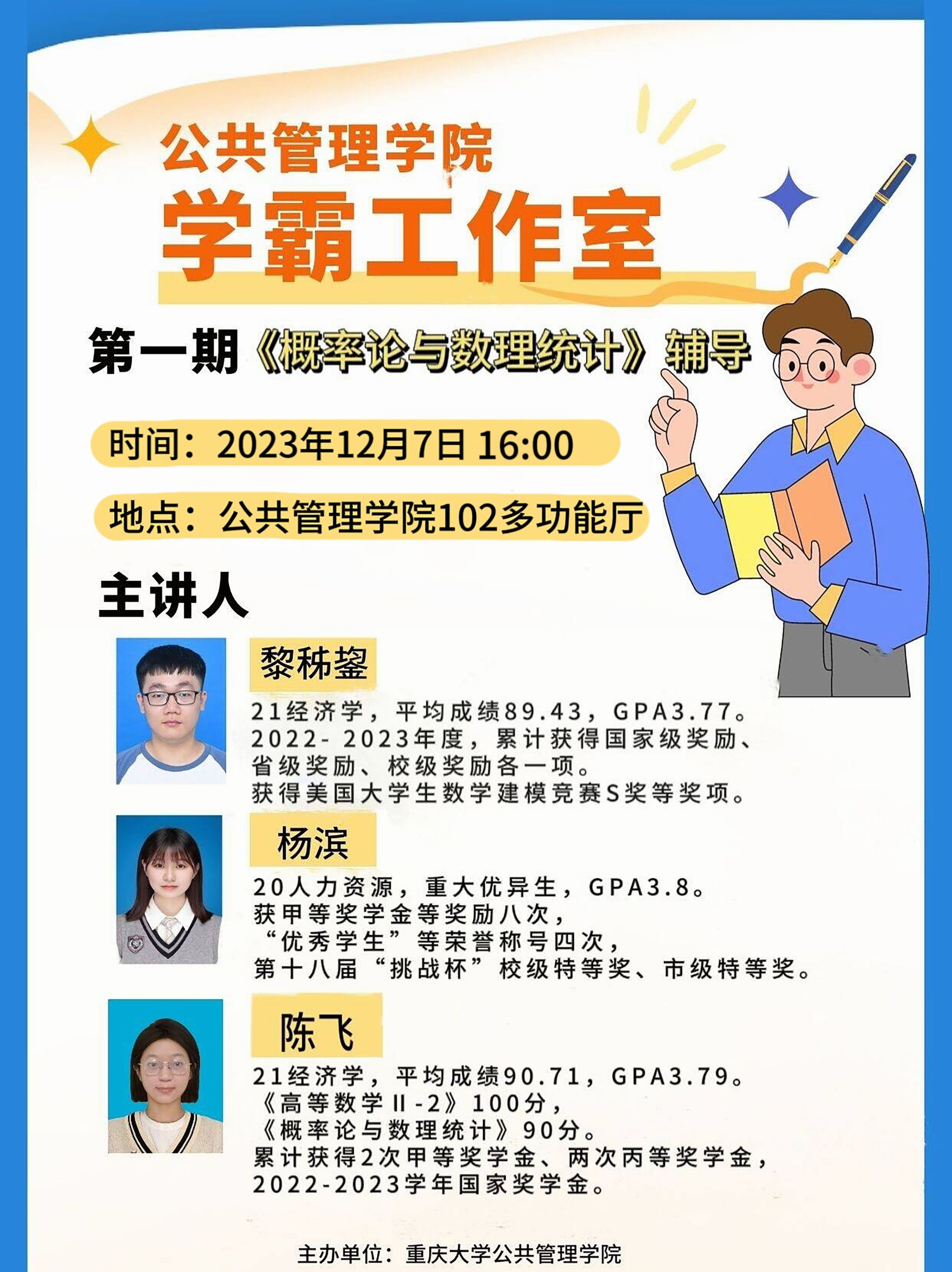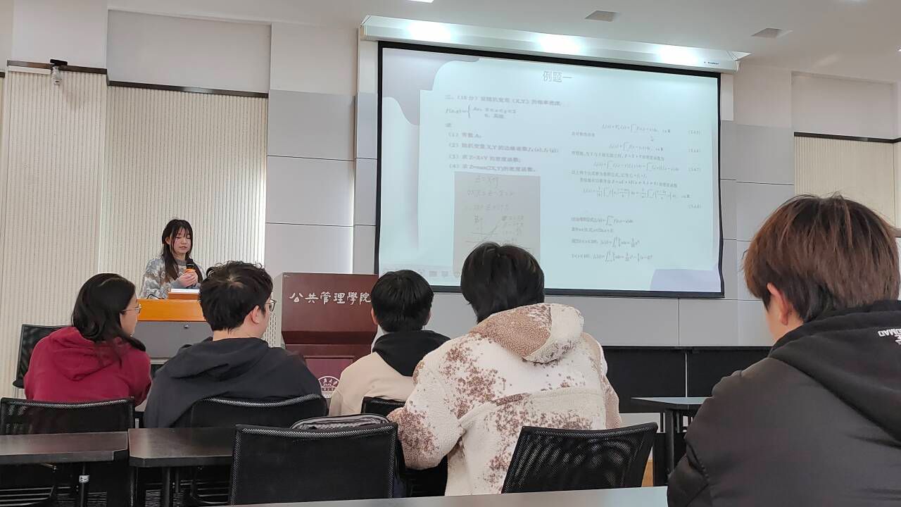 《概率论与数理统计》这门课程是公管学子们公认的“难题”,2023年12月7日16时,学院首期“学霸工作室”就邀请到三位“学霸”——20级人力资源专业的杨滨同学、21级经济学专业的黎秭鋆同学及陈飞同学,为大家带来《概率论与数理统计》的专题辅导和复习分享。本次活动在学院楼102教室,由团委学生会学习部部长吴若宬主持。