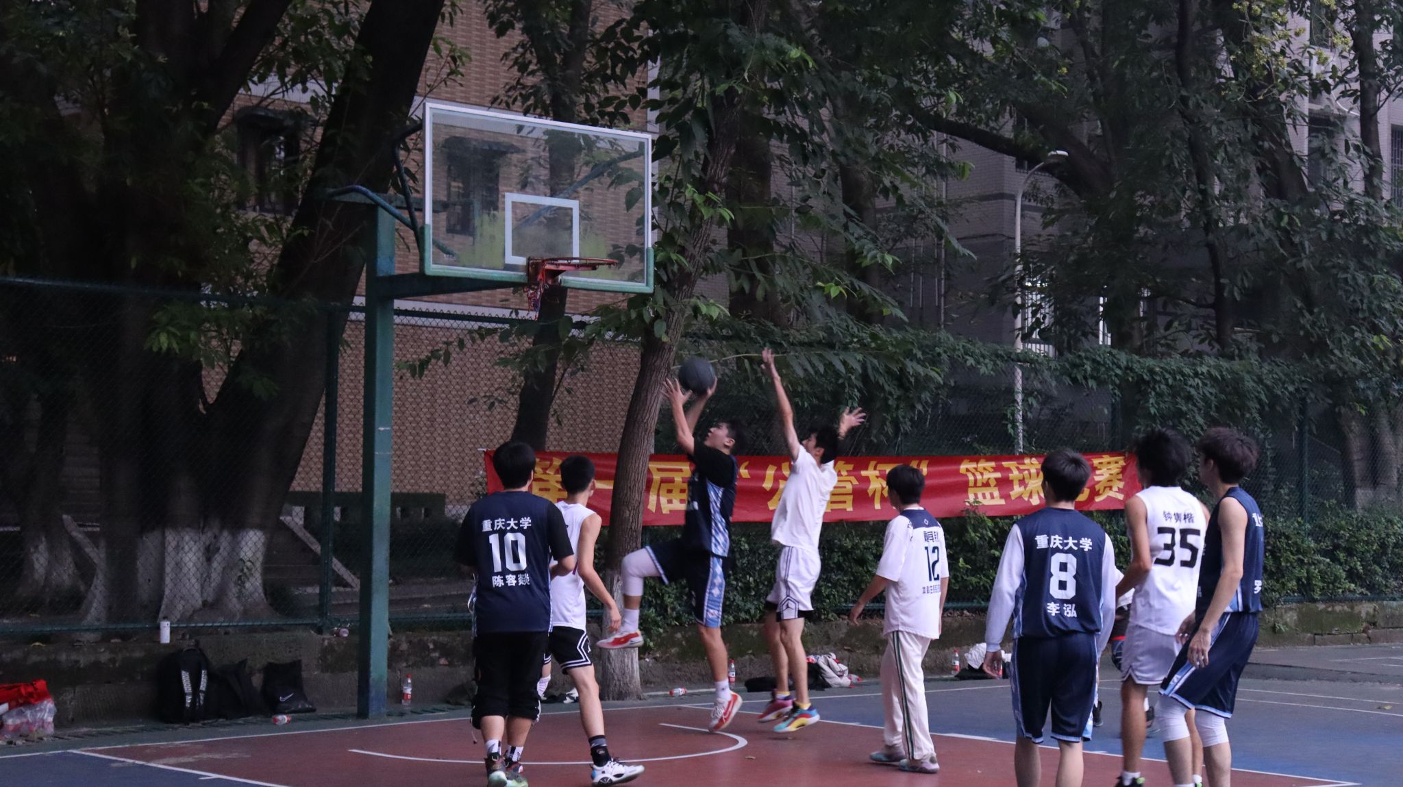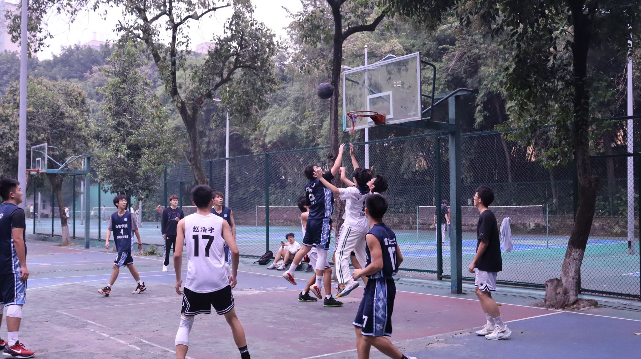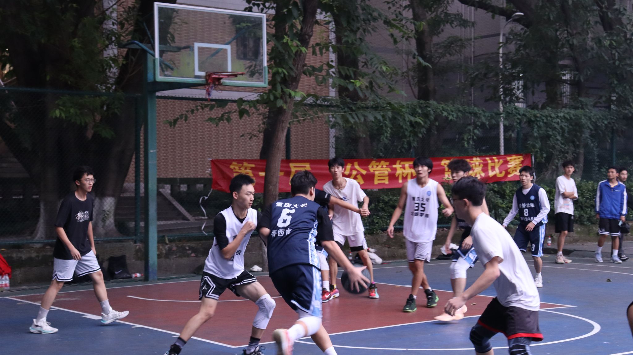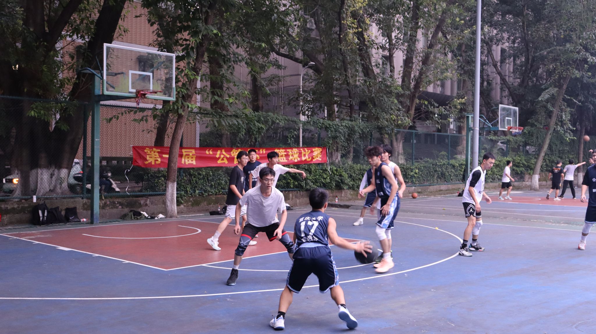 A区篮球场拉开帷幕。经济学联队与行管联队、国贸联队与城管联队分别展开对决。