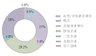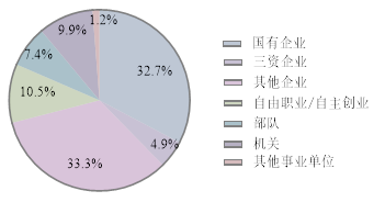就业单位以国有企业为主体,去往国有企业共53人,占比33%,集中在建筑业、金融业,还有分布在信息传输业、制造业和交通运输业等;其次是其他企业(民营等),共54人,占比33%,主要分布在电气水供应业、房地产业、金融业和信息传输业;三资企业有8人,在制造业、餐饮业、批发零售业都有分布;机关单位有16人,为选调生、普通公务员或办事人员;其他事业单位2人,在教育业和电力行业;有自由职业/自主创业17人,部队12人。