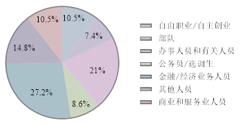 2015届本科毕业生中金融/经济业务人员占比最多,总共44人,占比28%,在基本都在金融业,其次为制造业人数较多;办事人员和有关人员总共34人,占比21%,建筑业最多,其余主要分布在电气水供应业和教育业及信息传输业;商业和服务业人员17人,行业分布多,比如制造业、餐饮业、金融业等;选调生/公务员共14人,有4人属于地方基层项目;其他人员有24人,行业分布较多,比如信息传输业、批发零售业、交通运输业等等;另外有17人进行自主创业,比如自由撰稿人、网店经营、烘焙行业、餐饮行业等等;最后还有12人进入部队,均在四川省。