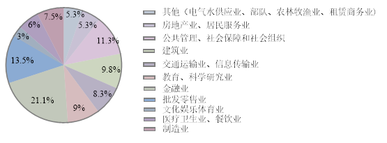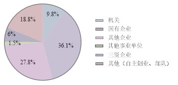 就业单位以国有企业为主体,去往国有企业共48人,占比36%,集中在建筑业、金融业和信息传输业;其次是其他企业(民营等),共37人,占比28%,主要分布在房地产业和教育业,其次为批发零售业,信息传输业和建筑业;三资企业有8人,主要在制造业,其余包括金融业、房地产业和医疗卫生业;机关单位有13人,为选调生或普通公务员;其他事业单位2人,都在金融业;另有自主创业24人,一半都在批发零售业。