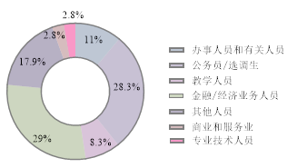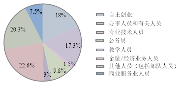 硕士毕业生以选调生或公务员较多,共41人,占就业总数的28%,其中39人都在重庆市;金融/经济业务人员42人,占比29%,基本都在金融业,其余则单独分散在房地产业、制造业等等;担任教学人员共有12人,其中9人都在高等教育单位,剩下2人分别在其他事业单位和其他企业中;办事人员和有关人员共16人,占比11%,交通运输业人数较多,其余散乱分布在信息传输业、居民服务维修业、金融业等等;另有4人在不同行业从事商业和服务业人员;专业技术人员为4人,主要在信息传输业;其他人员共26人,主要在公共管理社会保障组织、交通运输业、居民服务维修和文化娱乐业等。