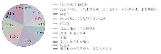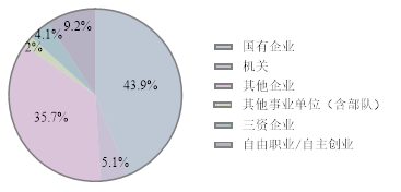 就业单位以国有企业为主体,去往国有企业共43人,占比44%,集中在建筑业、金融业,其次为交通运输业;其次是其他企业(民营等),共35人,占比36%,主要分布在房地产业和教育业,其次为批发零售业,信息传输业、制造业和租赁服务业;三资企业有4人,在房地产业、批发零售业和信息传输业;机关单位有5人,为选调生或普通公务员;其他事业单位2人,是文化体育行业教学人员和部队人员;另有自由职业和自主创业9人,主要从事写作方面工作。