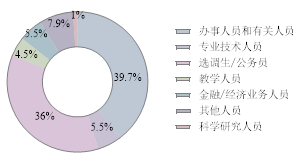 硕士毕业生就业职业较本科生更为集中,有一半都在公共管理、社会保障和社会组织中,三分之二为选调生或公务员。2022届选调生共18人,普通公务员共87人,总共占就业总数的36%,其中的67%集中在重庆市;金融/经济业务人员16人,占比5%,基本都在金融业和制造业;专业技术人员为16人,占比5%,分布在建筑业、制造业、卫生和社会工作、信息运输等;担任教学人员共有13人,占比4%,均在教育单位;办事人员及相关人员共116人,占比40%,广泛分布于公共管理社会保障组织(53人)、制造业(10人)、交通运输(10人)、商务服务业(7人)、科学研究和技术服务业(6人)、信息传输(6)等等;在科研设计单位的科学研究人员3人;另有其他人员23人,大多分布在制造业,也有少部分商业服务人员、卫生专业技术人员和新闻出版文化工作人员。