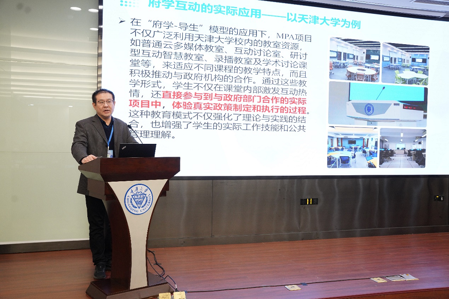 副院长李磊教授以《基于“府学-导生”互动的MPA人才培养过程优化》为主题进行了演讲。他分享了天津大学运用“府学-导生”互动模型培养MPA人才的生动实践和典型经验。