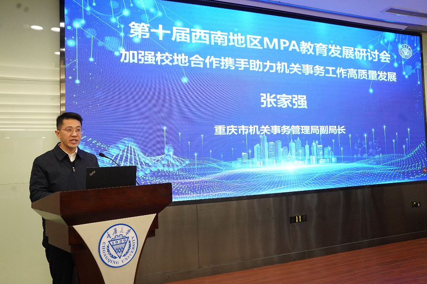重庆市机关事务管理局副局长张家强出席了开幕式,做了题为《加强校地合作,携手助力机关事务工作高质量发展》的主旨演讲。他详细介绍了重庆市机关事务工作的现状,深入分析了校地合作是助力机关事务工作高质量发展的重要举措。