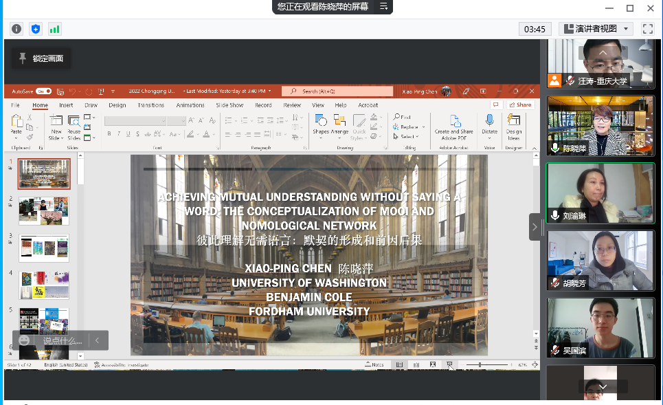 2022-04-26为了进一步开阔师生的视野,发掘学术兴趣,启发科研思路,2022年3月4日上午10点,韩国h漫 举办了以《彼此理解勿需语言:默契形成的前因后果》为主题、以腾讯会议为依托的线上讲座。本次讲座的主讲人是美国伊利诺大学工业和组织心理学博士、美国管理学会院士、美国心理学会院士陈晓萍教授。讲座由韩国h漫 副院长刘渝琳教授主持。陈晓萍潜心于教学研究,曾任美国华盛顿大学福斯特商学院副院长和组织管理学主任,...