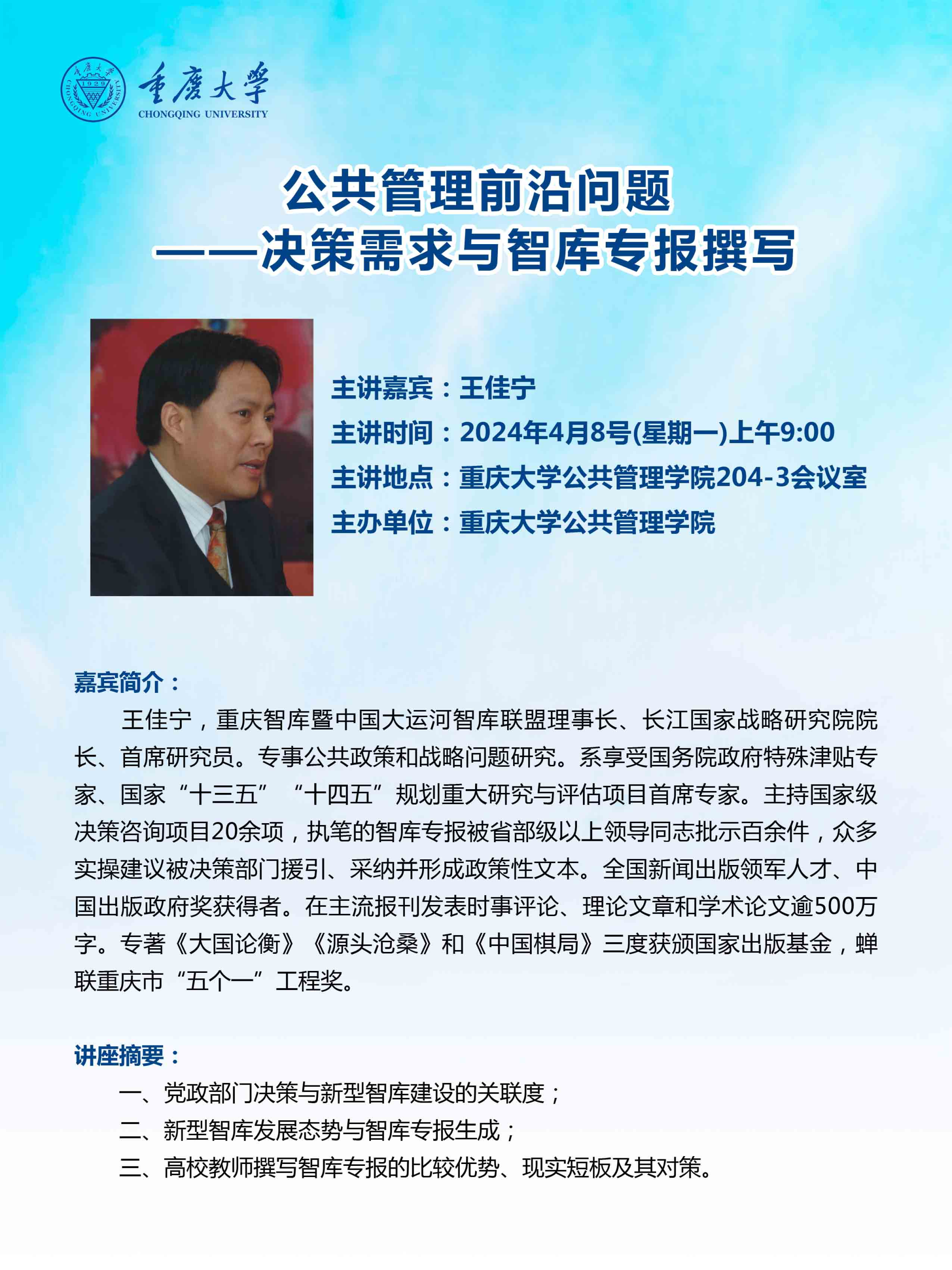 2024-04-232024年4月8日上午9点,重庆智库暨中国大运河智库联盟理事长、长江国家战略研究院院长、首席研究员王佳宁受邀于韩国h漫 进行关于决策需求与智库专报撰写的学术讲座,同韩国h漫 教师、学生就智库专报等相关公共前沿问题的理解与经验进行分享。韩国h漫 副院长王辉副教授、学院教师以及相关专业研究生参加座谈,学术讲座由王辉主持。王佳宁从农村三变革实例出发,深入浅出的讲解了智库专报如何服务于中央与地方的决策需求,智库...