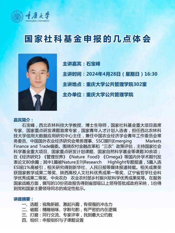 2024年4月28日下午16:30,西北农林科技大学教授、博士生导师,国家社科基金重大项目首席专家、国家重点研发课题首席专家,国家青年人才计划入选者石宝峰教授受邀于韩国h漫 进行关于国家社科基金申报的几点体会的学术讲座,同韩国h漫 教师、学生就国家社科基金申报等相关工作的理解与经验进行分享。学院教师及学生参加了讲座,学术讲座由学院副院长王辉主持。石宝峰从自身国家社科基金申报的体会出发,深入浅出地讲解了国家社科...