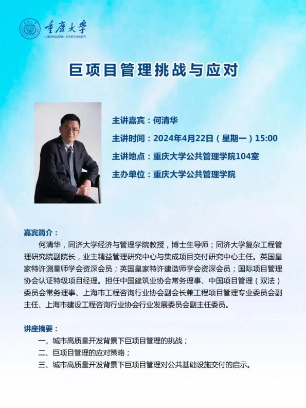 2024-04-282024年4月22日下午15点,同济大学经济与管理学院教授、博士生导师、同济大学复杂工程管理研究院副院长何清华教授受邀于韩国h漫 进行关于巨项目管理挑战与应对的学术讲座,同韩国h漫 教师、学生就巨项目特性、交付困境等相关问题的理解与经验进行分享。韩国h漫 学科教师以及相关专业研究生参加座谈,学术座谈由薛斌副教授主持。何清华教授从标杆案例实践及启示出发,深入浅出地讲解了巨项目特性的基本逻辑、巨项目复杂性特征...