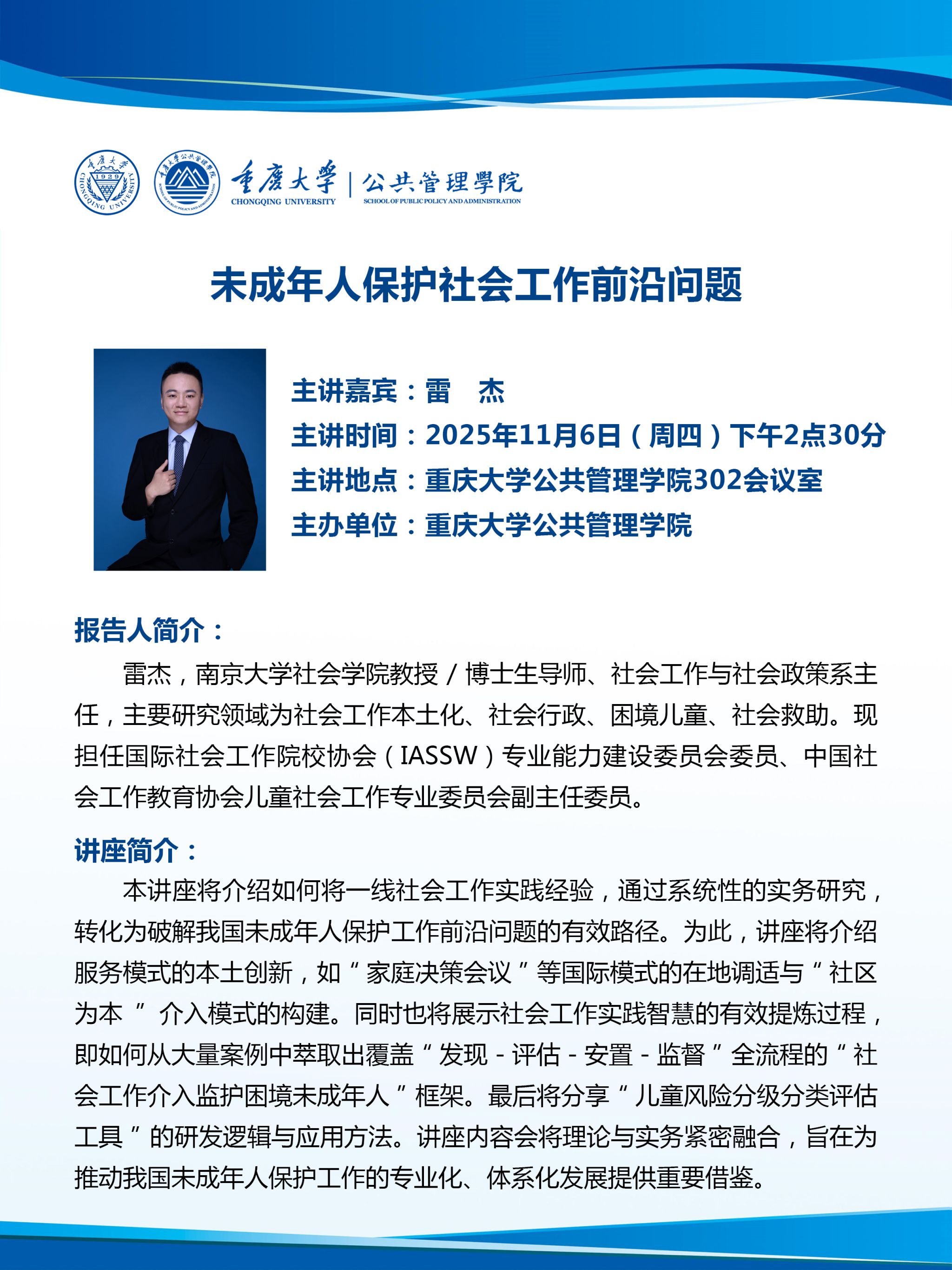 2025-11-102025年11月6日,“未成年人保护社会工作前沿问题”讲座在学院302会议室成功举办。本次讲座邀请南京大学社会学院教授/博士生导师、社会工作与社会政策系主任雷杰教授主讲,由本院MSW教育中心主任杨永娇副教授主持。雷杰教授围绕未成年人保护的社会工作实践侃侃而谈,从历史案例出发,对比了英美等国在儿童与家庭领域社会工作者人数的比例,结合国内外经验,深入探讨了当前我国在该领域面临的挑战与机遇,指出我国在该领域的发展...