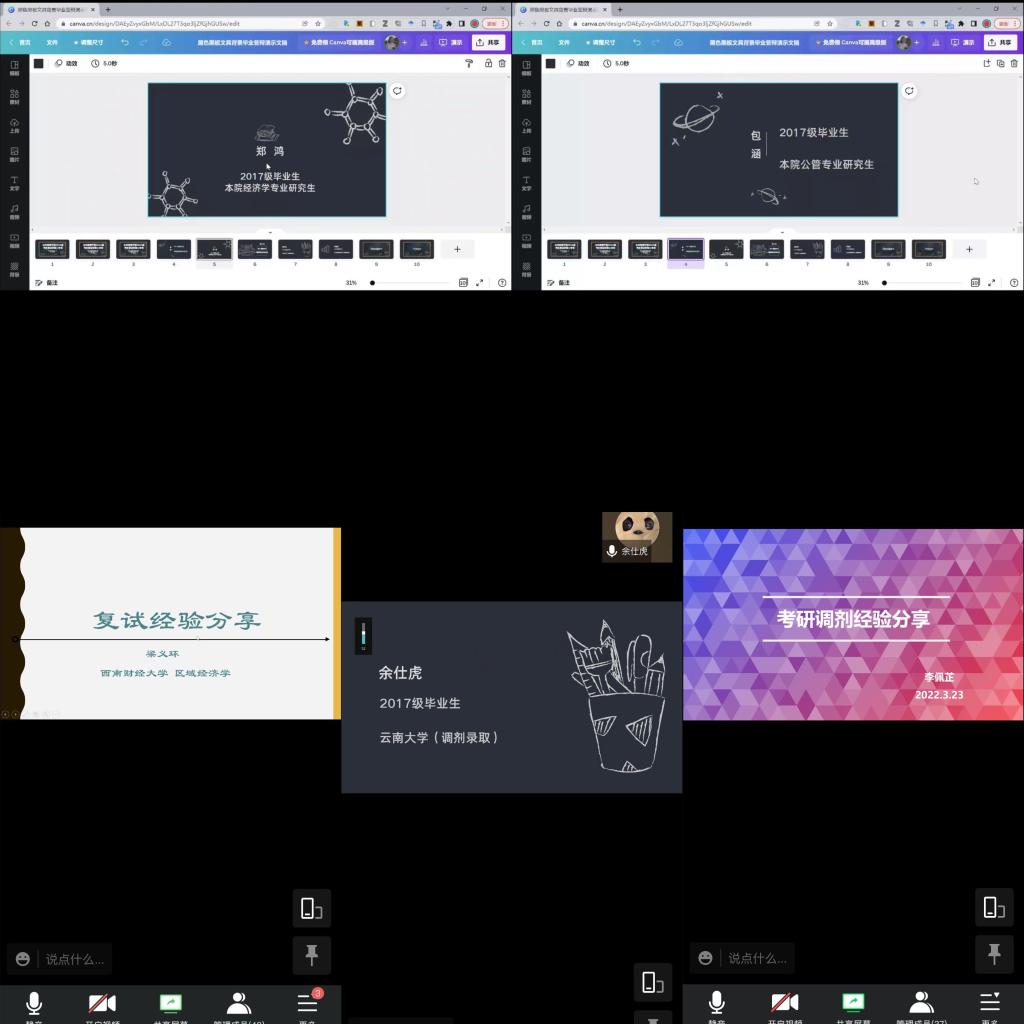 2022-04-07时维三月下旬,全国各院校考研初试分数线陆续公布,复试即将进行。为了帮助学院2022届本科考研学子们更好地准备研究生入学复试,学院邀请了五位2021届和2020届考研成功、有着丰富复试经验的学长学姐为同学们们进行考研复试经验分享,会议于2022年3月23日晚19:30以线上会议方式举行,由韩国h漫 团委书记、2022届辅导员徐柳老师主持、42名考研学子参会。首先为大家进行分享的是目前在韩国h漫 2020级产业经济学专业就读的郑鸿学...