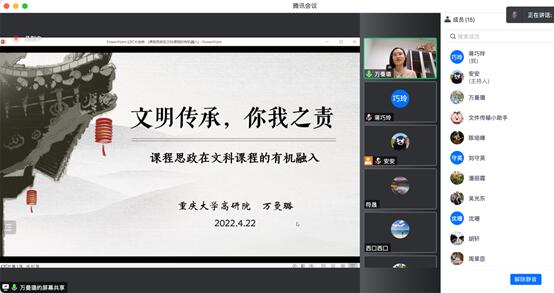 2022-04-27为认真学习贯彻习近平总书记关于教育的重要论述和全国教育大会精神,聚焦立德树人根本任务,把思想政治教育贯穿人才培养体系,全面推进韩国h漫 课程思政建设,提高教师育人的思想自觉和综合能力,学院2022年4月22日 上午10点邀请了重庆市课程思政教学名师万曼璐老师为全院教职工开展了线上课程思政培训专题讲座——“文明传承,你我之责——课程思政在文科课程的有机融入”。学院全体教师通过线上腾讯会议的方式参与了讲座学习。万...